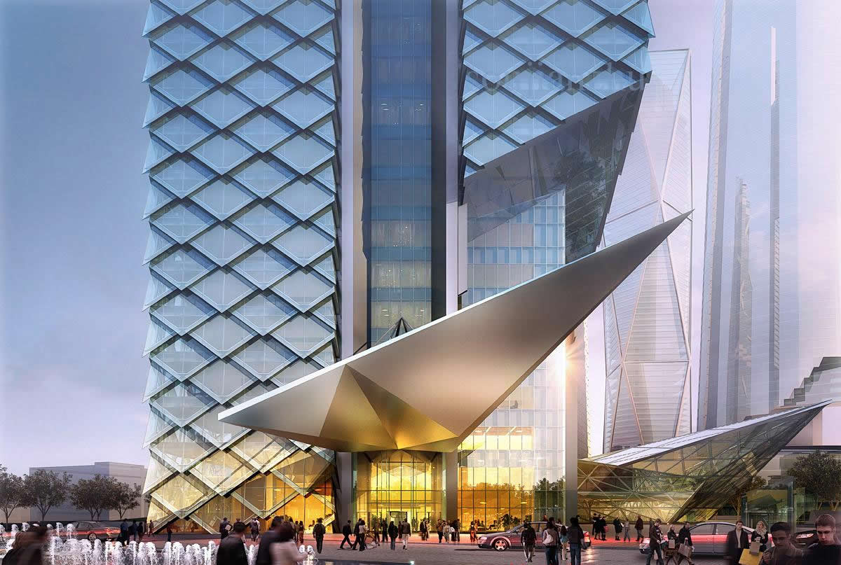 一號塔和二號塔高度分別為450m和390m,兩座塔樓中較高的一號塔,有88層,建筑頂部和基部迷你小塔的體形切割呈V字形;77層高的二號塔,體形切割呈一條斜向的連續(xù)線,當(dāng)人們圍著建筑走時,看到的是圍繞建筑核心向外發(fā)射的圖案。