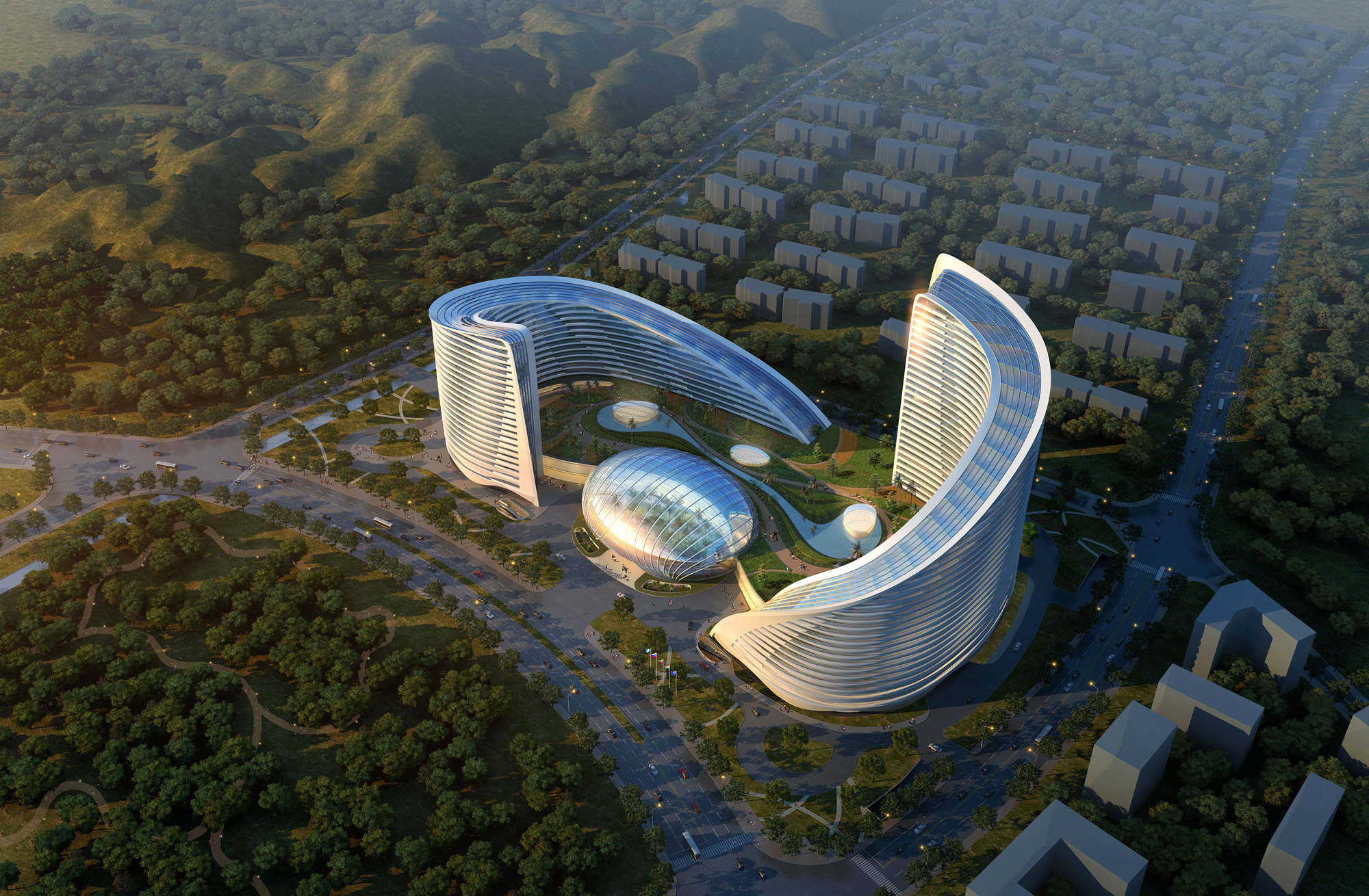 建筑在整體設(shè)計(jì)上,外觀處理以水平線(詞條“水平線”由行業(yè)大百科提供)條為主導(dǎo),立面采用低能耗玻璃配合精心設(shè)計(jì)的建筑幕墻系統(tǒng),極具現(xiàn)代感。整體項(xiàng)目特色在于建筑造型提供的結(jié)構(gòu)幾何要素是東塔與西塔形成的花瓣與資源圃為花蕾中心球形殼體圍合的花朵形體。