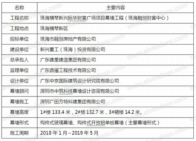 珠海新興際華財富廣場項目,位于廣東省珠海市橫琴區(qū),總建筑面積127791.45㎡,地面建筑面積:98084.51,其中地下2層,地上兩棟塔樓(詞條“塔樓”由行業(yè)大百科提供),分別為24層、29層。地上有商業(yè)、辦公、平層公寓,業(yè)態(tài)主要為商業(yè)、LOFT辦公和公寓。珠海橫琴新興際華財富廣場項目幕墻工程主要系統(tǒng)包括構(gòu)件(詞條“構(gòu)件”由行業(yè)大百科提供)式玻璃幕墻、開放式鋁單板幕墻、全玻幕墻(詞條“全玻幕墻”由行業(yè)大百科提供)(大堂)、鋁單板雨篷、鋁合金有框地彈門、不銹鋼地彈門、鋁合金百葉、蜂窩鋁單板吊頂幕墻、觀光電梯幕墻、玻璃欄桿幕墻等。項目信息如下表所示: