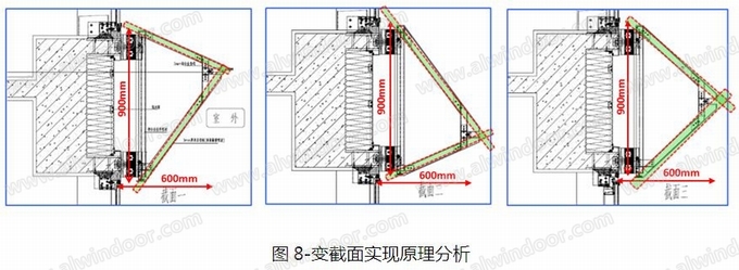 為此,在繼續(xù)保持原桿件選材(40*40*3mm的鋁方通)的情況下,只需要對四個角部位置原設(shè)計方案采用4-ST4.2X16不銹鋼盤頭自攻釘連接的方式加以優(yōu)化,采用靈活多變的創(chuàng)新連接方式,即可滿足上、下二支傾斜桿件任意尺寸調(diào)節(jié)的需要。使鋁單板線條最前端沿垂直方向上下移動,即可實現(xiàn)此變截面,仍然可以保持懸挑固定值為600mm不變。如圖8所示: