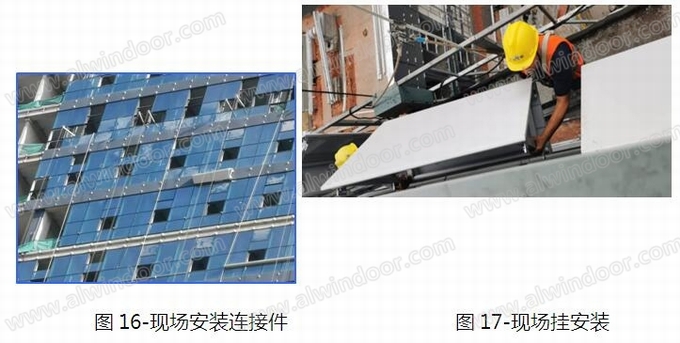 第一步:借助總包懸挑腳手架(或者自行搭設(shè)吊籃)先行安裝玻璃幕墻的骨架,及變截面鋁單板裝飾線條連接件。如圖16所示: