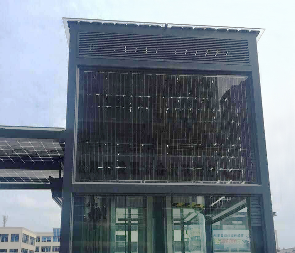 太陽(yáng)能玻璃幕墻通過(guò)采集光能,為電梯供電,從而帶動(dòng)電梯內(nèi)的照明和換氣系統(tǒng)等用電設(shè)備。全玻光伏組件采用低透光率設(shè)計(jì),為電梯提供更多的電量,同時(shí)光伏組件整體與電梯框架格調(diào)一致,使整座電梯美麗大方,充分體現(xiàn)了“綠色、環(huán)保、節(jié)能”的主題。